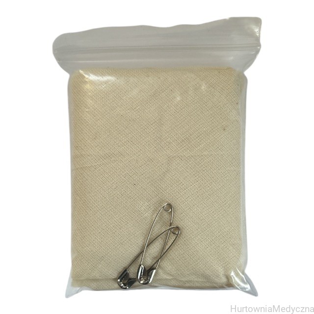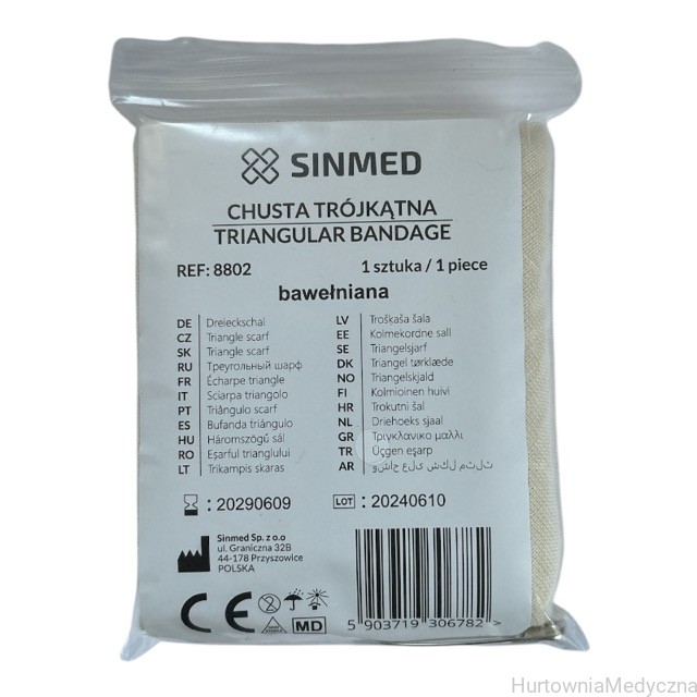 Chusta trójkątna bawełniana niejałowa 96cm x 96 cm x 136 cm SINMED + AGRAFKI 2 SZT, powszechnie nazywana temblakiem, stosowana jest w czasie udzielania pierwszej pomocy do tymczasowego unieruchomienia kończyny w przypadku zwichnięć albo złamań: obojczyka, kości ramieniowej, kości przedramienia lub dłoni.