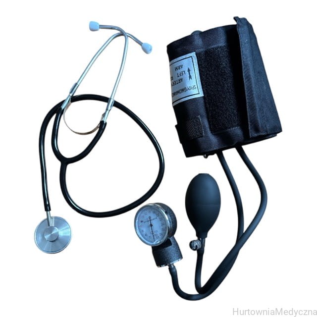 Czarny, bawełniany, mankiet w standardowym rozmiarze, z metalową klamrą, 2-wężykową dętką, gruszkę, jednostronny stetoskop.