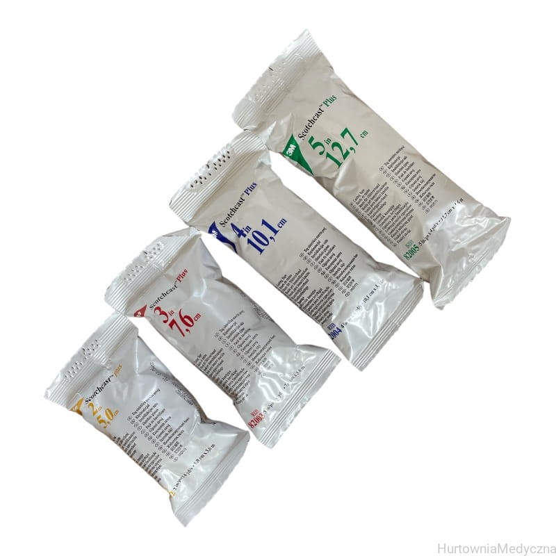 Opaska syntetyczna usztywniająca SCOTCHCAST kolor BIAŁY - jest to opaska usztywniająca zastępująca gips. Wykonana z tkanego włókna nasyconego żywicą poliuretanową. Poddana działaniu wilgoci sztywnieje na skutek reakcji chemicznej pomiędzy żywicą i woda. Twardnienie trwa ok. 3-8 min. Całkowita twardość Scotchcast Plus uzyskuje po ok. 30-45 min. Charakteryzuje się łatwością nakładania a jednocześnie jest mocnym opatrunkiem usztywniającym. Gips jest trwały i lekki, doskonale dopasowany o gładkiej powierzchni. Pomimo cienkiej warstwy włókna szklanego Scochcast jest równie wytrzymały jak gips a dodatkowo jest wodoodporny umożliwiając pacjentowi kąpiel. Scotchcast Plus jest całkowicie bezpieczny w stosowaniu.Opaska dzięki tkaniu jest w pełni przepuszczalna dla powietrza i umożliwia suszenie wewnętrznej warstwy izolacyjnej po kąpieli. Jest całkowicie przezierny dla promieni rentgenowskich, nie trzeba zwiększać dawki. Trwałość nie rozpakowanej opaski wynosi 3 lata. Długość rolek jest standardowa i wynosi 3,6m. Produkt przeznaczony jest do unieruchamiania kończyn w przypadku złamań, skręceń stawowych i innych uszkodzeń aparatu kostno-stawowo-mięśniowego. Może być użyty do zaopatrywania świeżych urazów lub jako opatrunek wtórny.