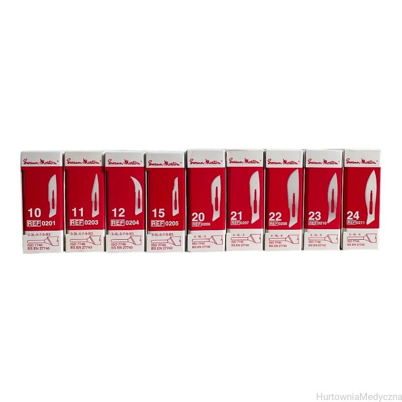 Ostrza wymienne SWANN MORTON do skalpeli A'100 szt. Jednorazowe ostrza wykonane ze stali węglowej , jałowe, rozmiar wygrawerowany na ostrzu.