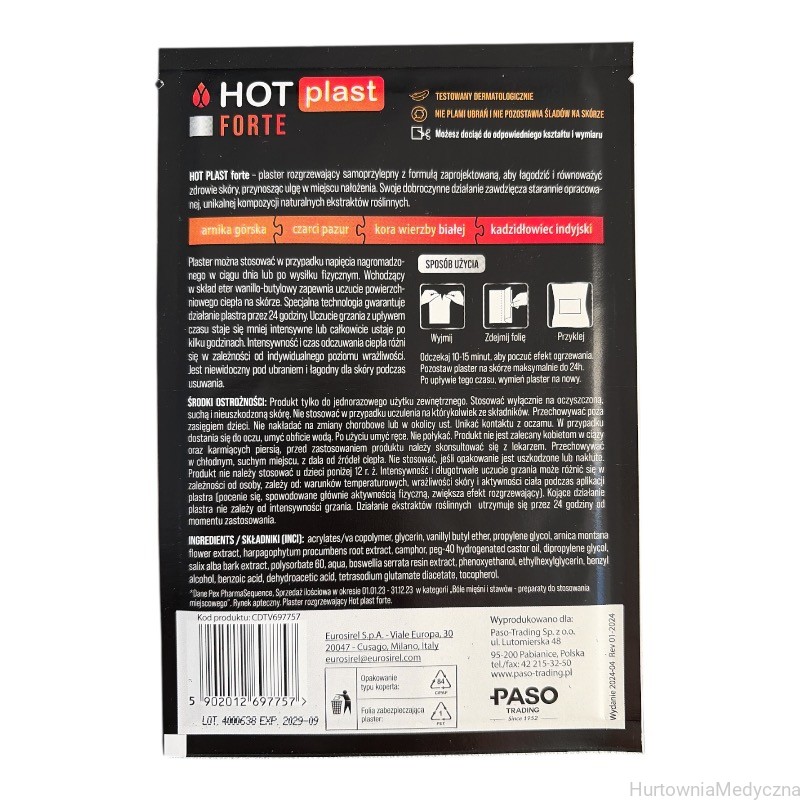HOT PLAST FORTE – łagodzi ból aż do 24 h, niezależnie od uczucia grzania, które z upływem czasu staje się coraz delikatniejsze lub całkowicie ustaje po kilku godzinach. Intensywność i czas odczuwania ciepła różni się w zależności od indywidualnego poziomu wrażliwości. Jest niewidoczny pod ubraniem i łagodny dla skóry podczas usuwania.