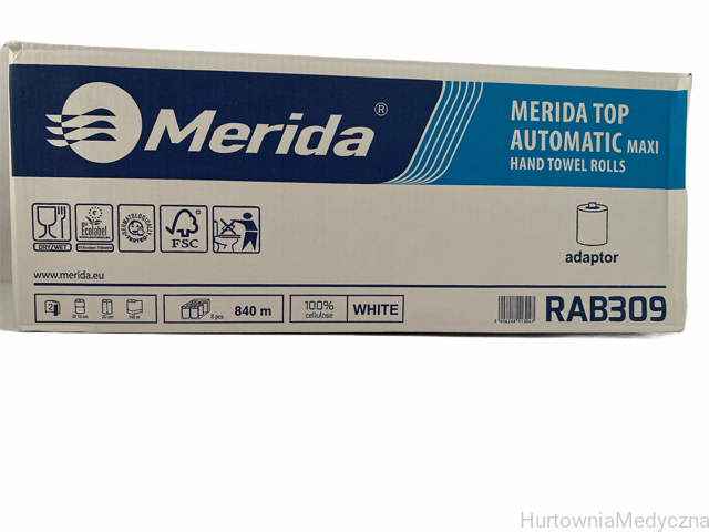 Ręczniki papierowe RAB 309 w roli z adapterem Merida Top Automatic MAXI, białe dwuwarstwowe , dł 140 m, karton 6 rolek