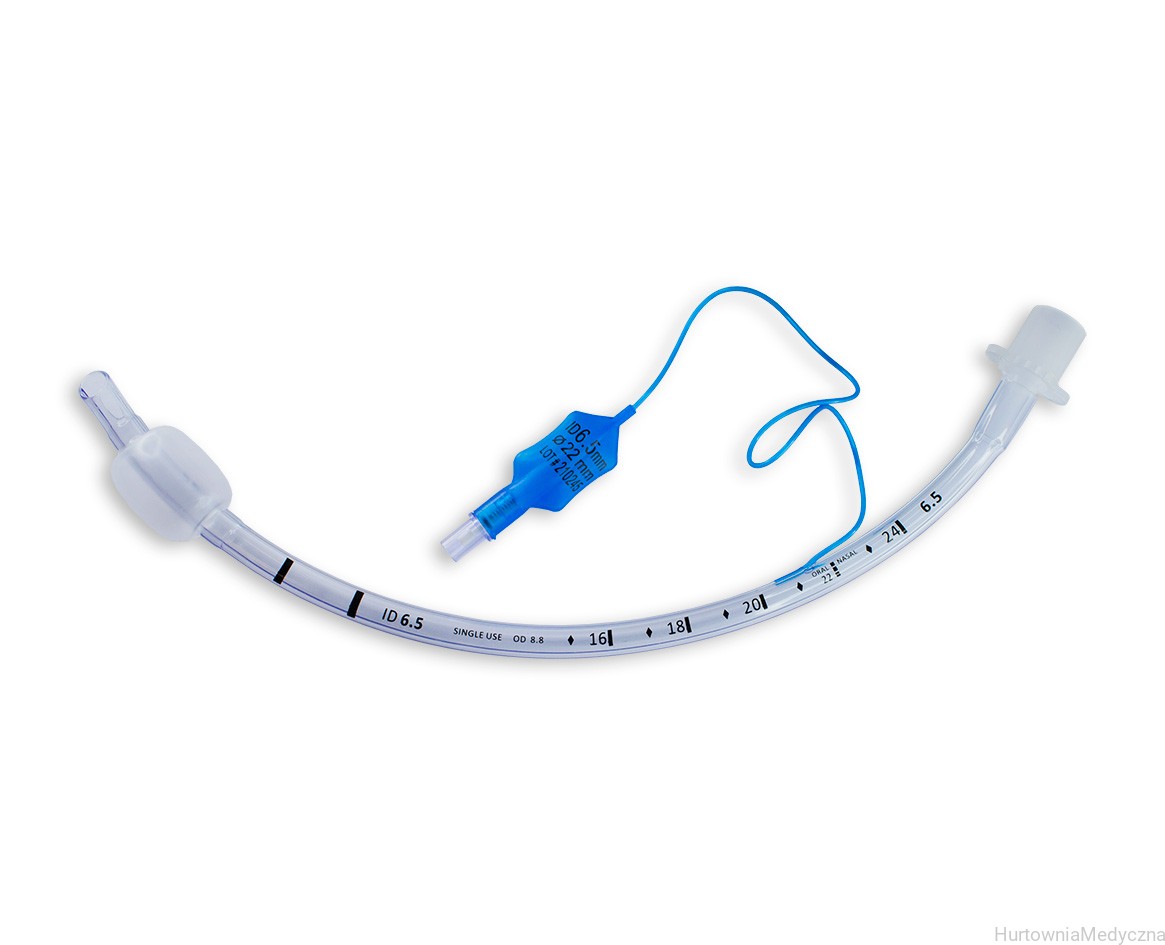 Rurka intubacyjna z mankietem. Rurka wykonana jest z miękkiego PVC, zapewniającego dużą elastyczność, posiada znacznik RTG na całej długości rurki oraz boczny otwór Murphy’ego, jest skalowana co 1 cm.