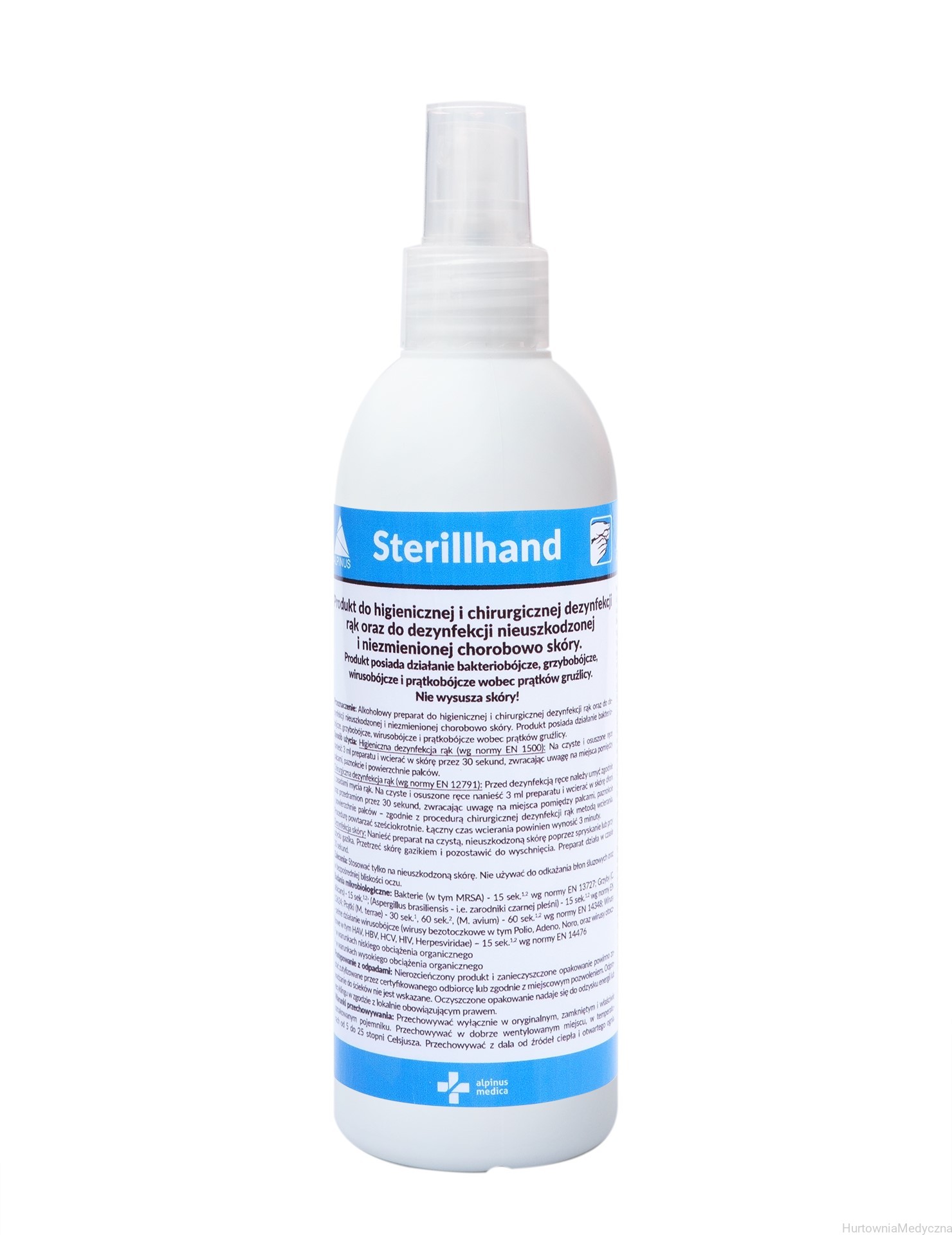 Sterillhand płyn do dezynfekcji rąk i skóry 250 ml z atomizerem to preparat do higienicznej i chirurgicznej dezynfekcji rąk oraz do dezynfekcji nieuszkodzonej i niezmienionej chorobowo skóry.