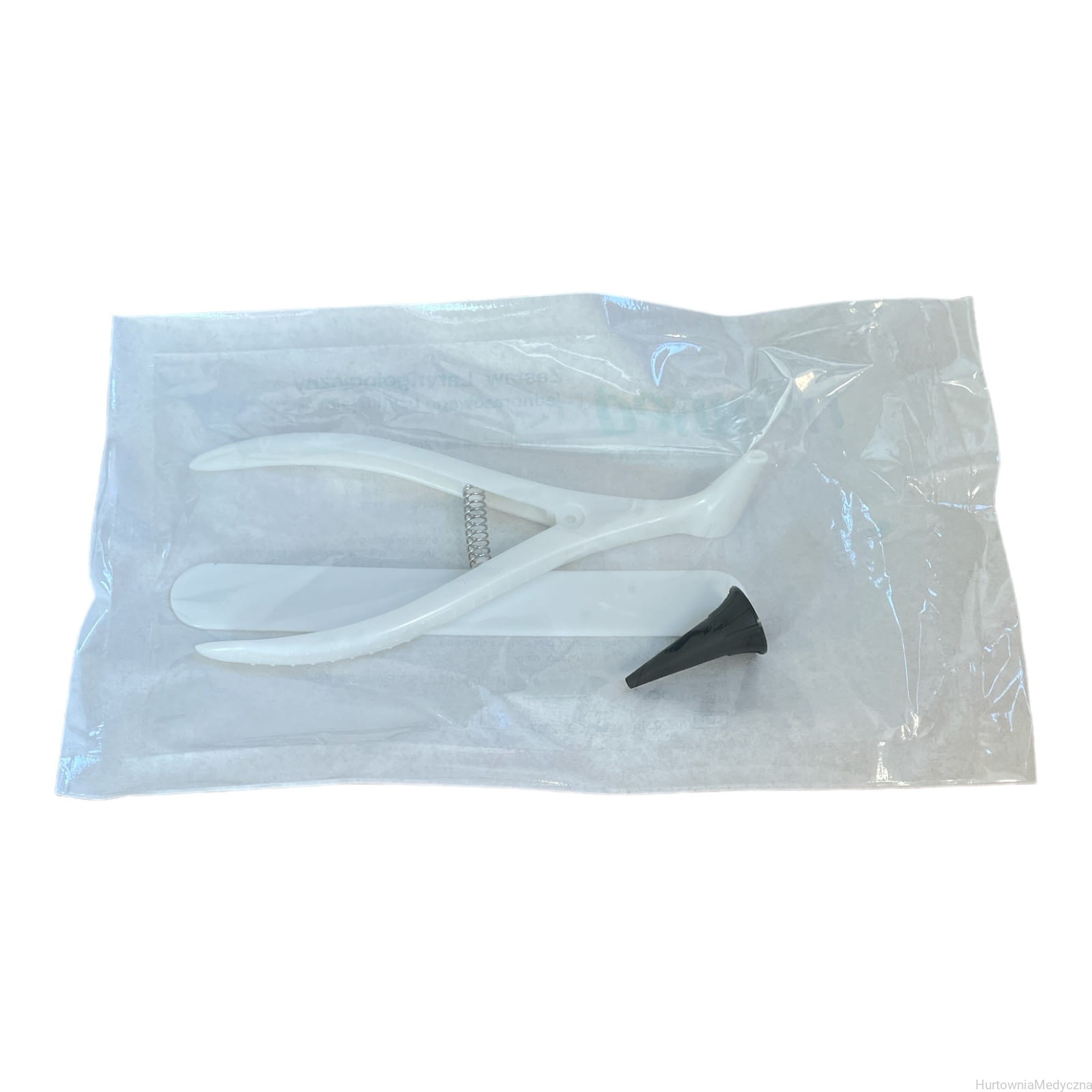 Zestaw zawiera: szpatułkę laryngologiczną, wziernik do nosa, wziernik do ucha